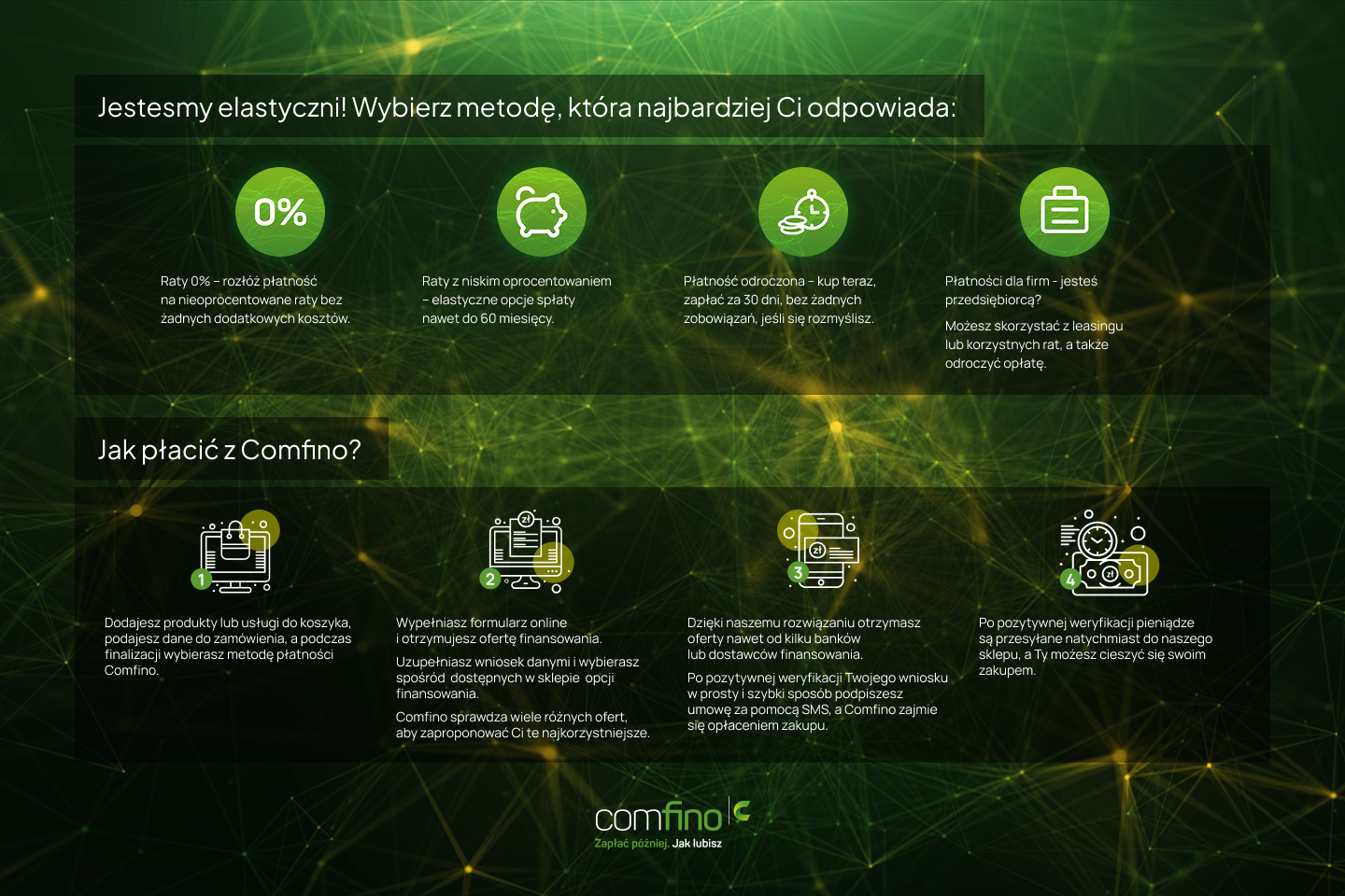 Płatności ratalne Comfino to sposób na sfinansowanie zakupów online i stacjonarnych, pozwalający na rozłożenie płatności na raty (w tym raty 0%) lub skorzystanie z płatności odroczonych ("Kup teraz, zapłać później"). Aby skorzystać z Comfino, dodaj produkt do koszyka w sklepie, wybierz "Raty Comfino" jako metodę płatności, wypełnij krótki wniosek online, a po otrzymaniu pozytywnej decyzji i podpisaniu umowy (często SMS-em), Comfino opłaci Twój zakup.