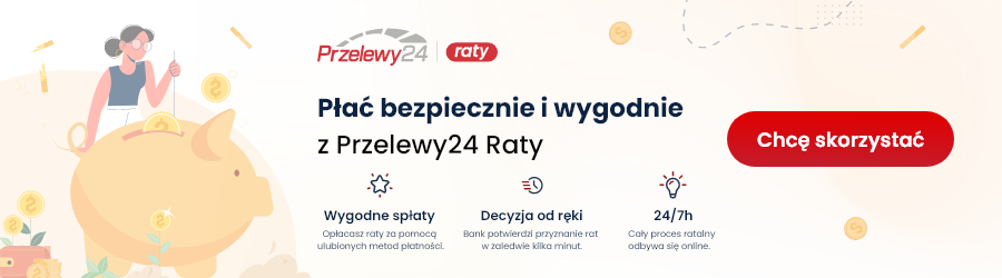 Przelewy24 Raty to usługa, dzięki której udostępnisz kupującym możliwość zakupu produktów z Twojego sklepu na raty. Koszty związane z zawarciem umowy kredytowej ponosi kupujący. Usługa jest dostępna w ramach Shoper Płatności x Przelewy24