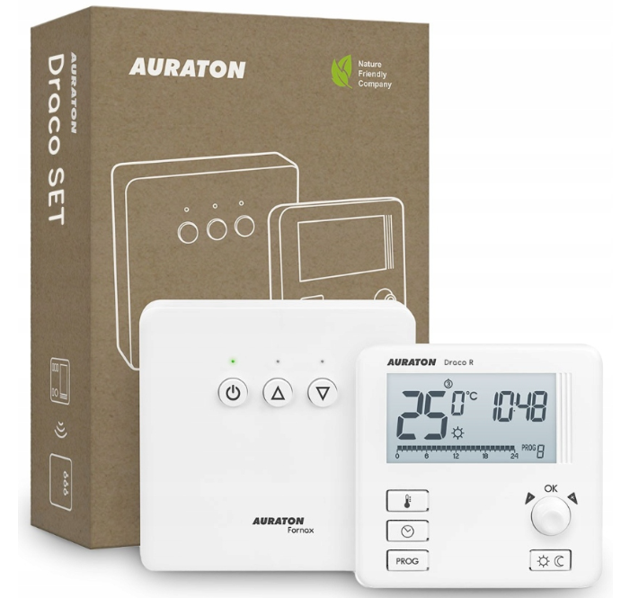 AURATON Draco SET to bezprzewodowy zestaw przeznaczony do zarządzania pracą urządzenia grzewczego w Twoim domu lub mieszkaniu. System składa się z eleganckiego termostatu oraz sterownika, który podłączysz do kotła elektrodowego. System komunikuje się bezprzewodowo, nie wymaga instalacji okablowania, poza prostym podłączeniem do urządzenia grzewczego.
